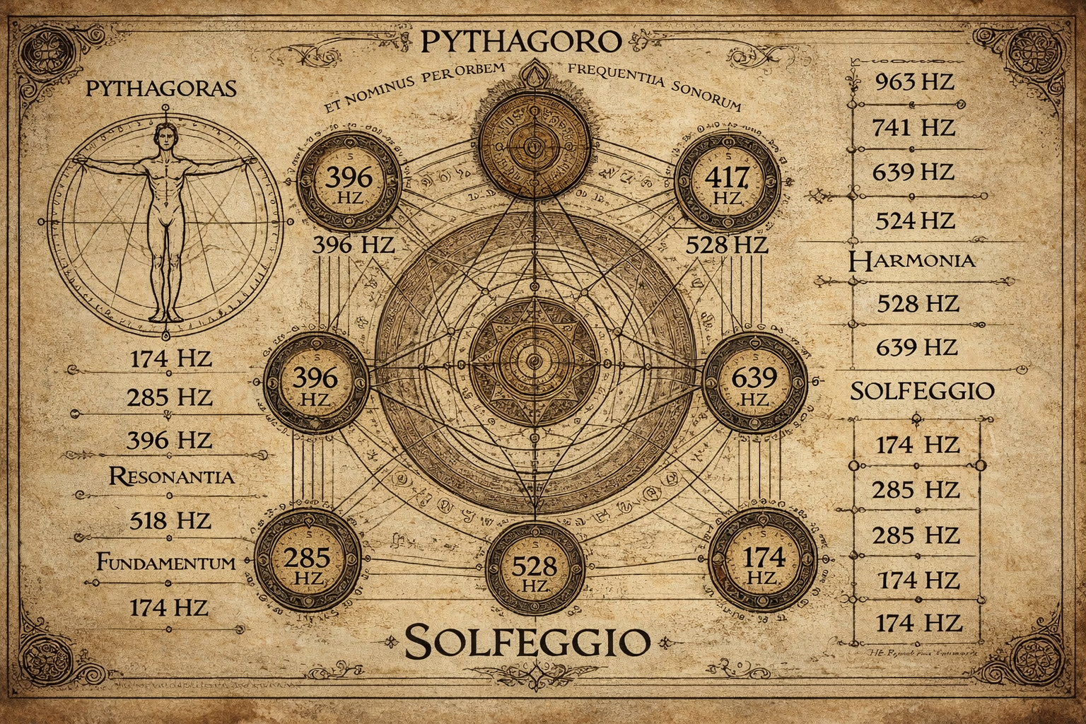 Dokonce už starověký řecký filozof a matematik Pythagoras, žijící kolem roku 570-495 př. n. l., objevil harmonické proporce, které se používají k vytváření hudebních tónů. Jeho práce na vztahu mezi čísly a hudbou vedla k vývoji hudebních stupnic založených na matematických poměrech. Solfeggio frekvence jsou založeny na těchto principech. Pythagoras zkoumal, jak frekvence a vibrace mohou ovlivnit tělo a mysl, což je základním kamenem teorie Solfeggio frekvencí.
