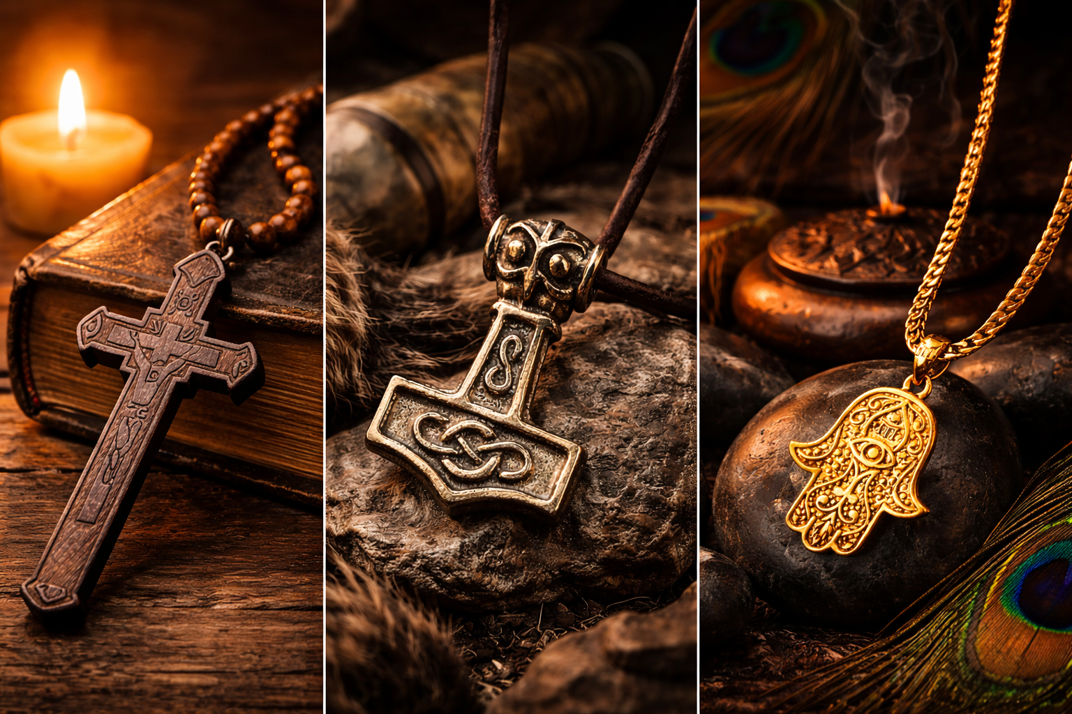 Samozřejmě i dnes, ale především v dřívějších dobách bylo zcela běžné nosit při sobě nějaký drobný náboženský symbol, ať už ve formě přívěsku například na krku. Jako nejčastější si uveďme například kříž, medailonky svatých, Hamsa (neboli Ruka Fatimy), Mjölnir (neboli Thórovo kladivo) a nespočet dalších...
