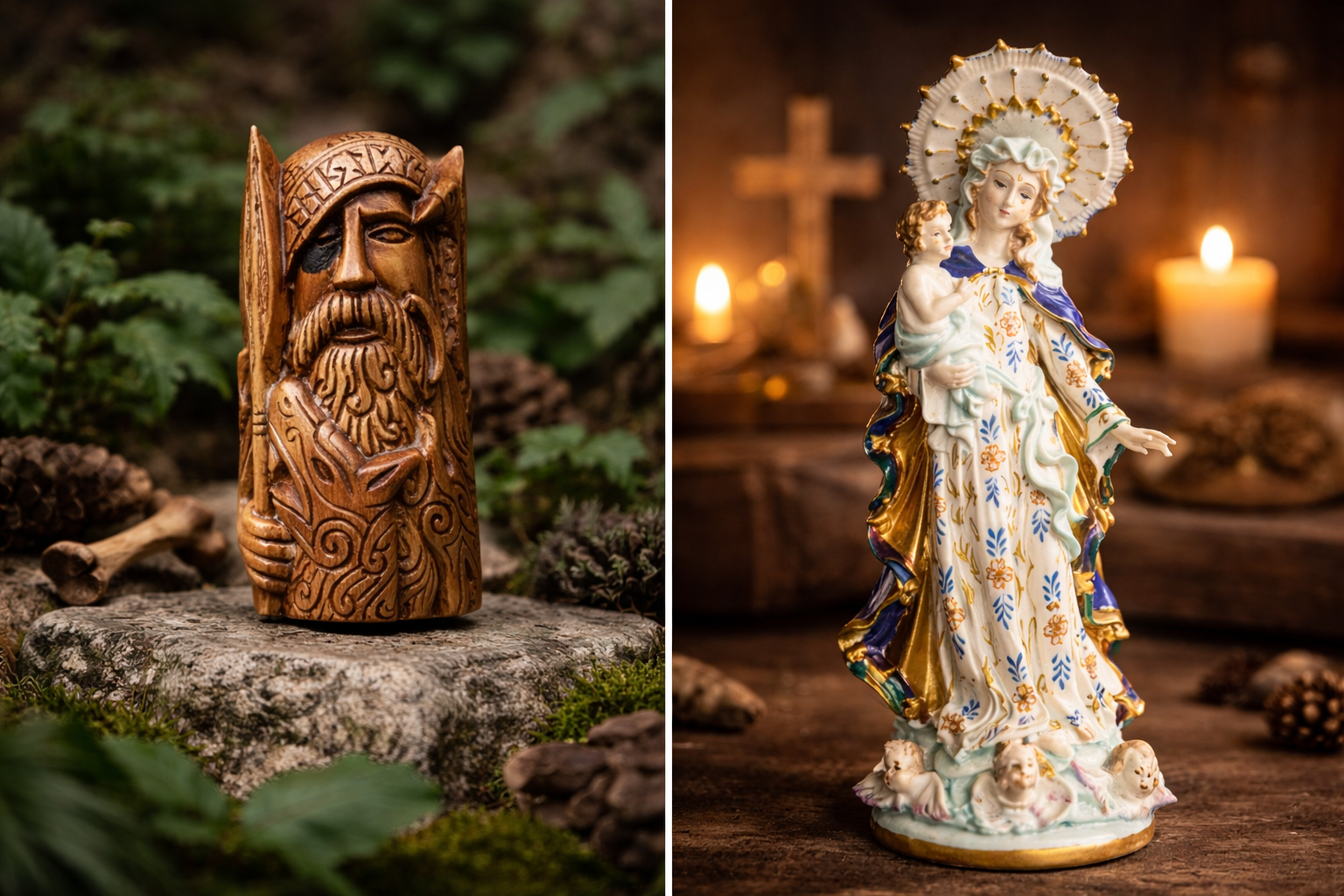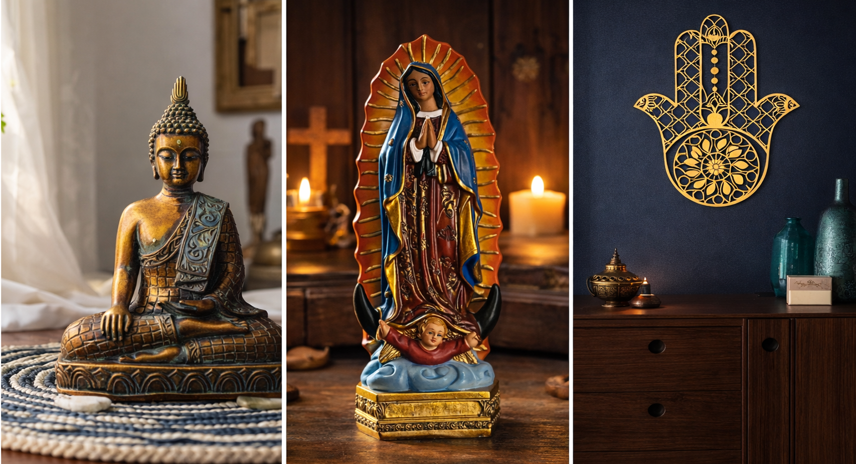 O něco většími verzemi putovních figurek a obrázků, které však již neslouží jako příruční modlitební pomůcka na cesty, ale jako součást třeba domácí svatyně a vlastně též i dekorace obydlí jsou různé obrazy a sošky. Ty mohou být součástí dokonce i menších domácích modliteben umístěných například ve výklencích či dokonce samostatných místnostech.